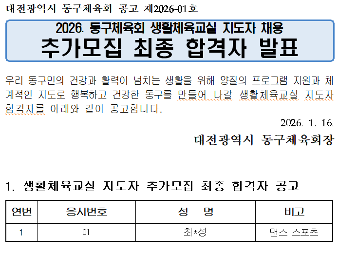 2026. µ¿±¸Ã¼À°È¸ »ýȰüÀ°±³½Ç ÁöµµÀÚ Ã¤¿ë Ãß°¡¸ðÁý ÃÖÁ¾ ÇÕ°ÝÀÚ ¹ßÇ¥